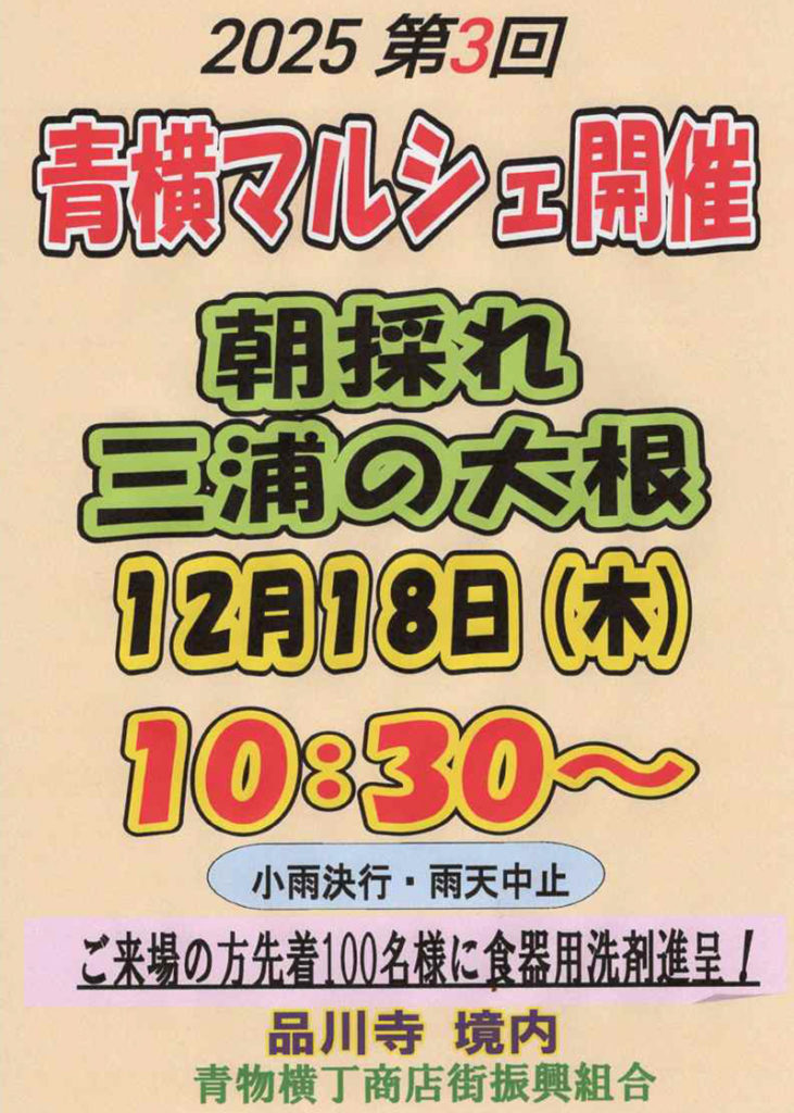 12/18(木)2025 第3回青横マルシェ開催by aoyoko-adminin > 商店街からのお知らせon 投稿日: 2025年12月17日2025年12月17日 令和7年12月18日(木)10:30~ 第3回青横マルシェ開催。 品川寺にて三浦の朝採れ大根販売を添付ポスターの通り開催します。 ご来場の方先着100名様に食器用洗剤をプレゼント! この機会にぜひ青物横丁にお越しください! ページを印刷する