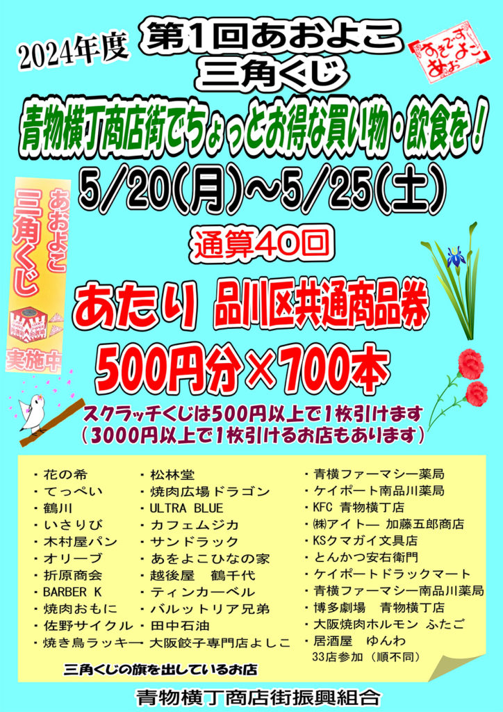 5/20(月)~5/25(土)2024年度 第1回あおよこ三角くじ 開催!by aoyoko-adminin > 商店街からのお知らせon 投稿日: 2024年5月15日2024年5月15日 2024年5月20日(月)~5月25日(土)、「2024年度 第1回あおよこ三角くじ」を開催! 商店街のお店でお買い物をして、スクラッチくじを引いて、品川区共通商品券を当てよう! イベントの詳細は以下のポスターをご確認ください。 ページを印刷する