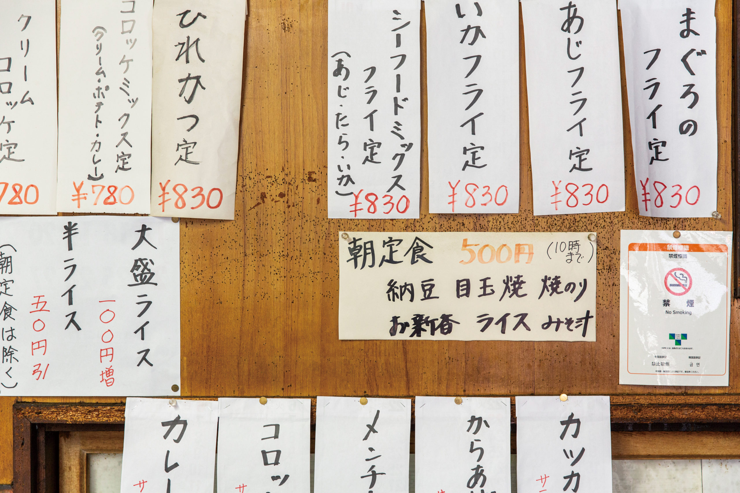 The handwritten menus posted on the walls are filled with a large number of items, and many people come to enjoy the handmade set menus at lunchtime.