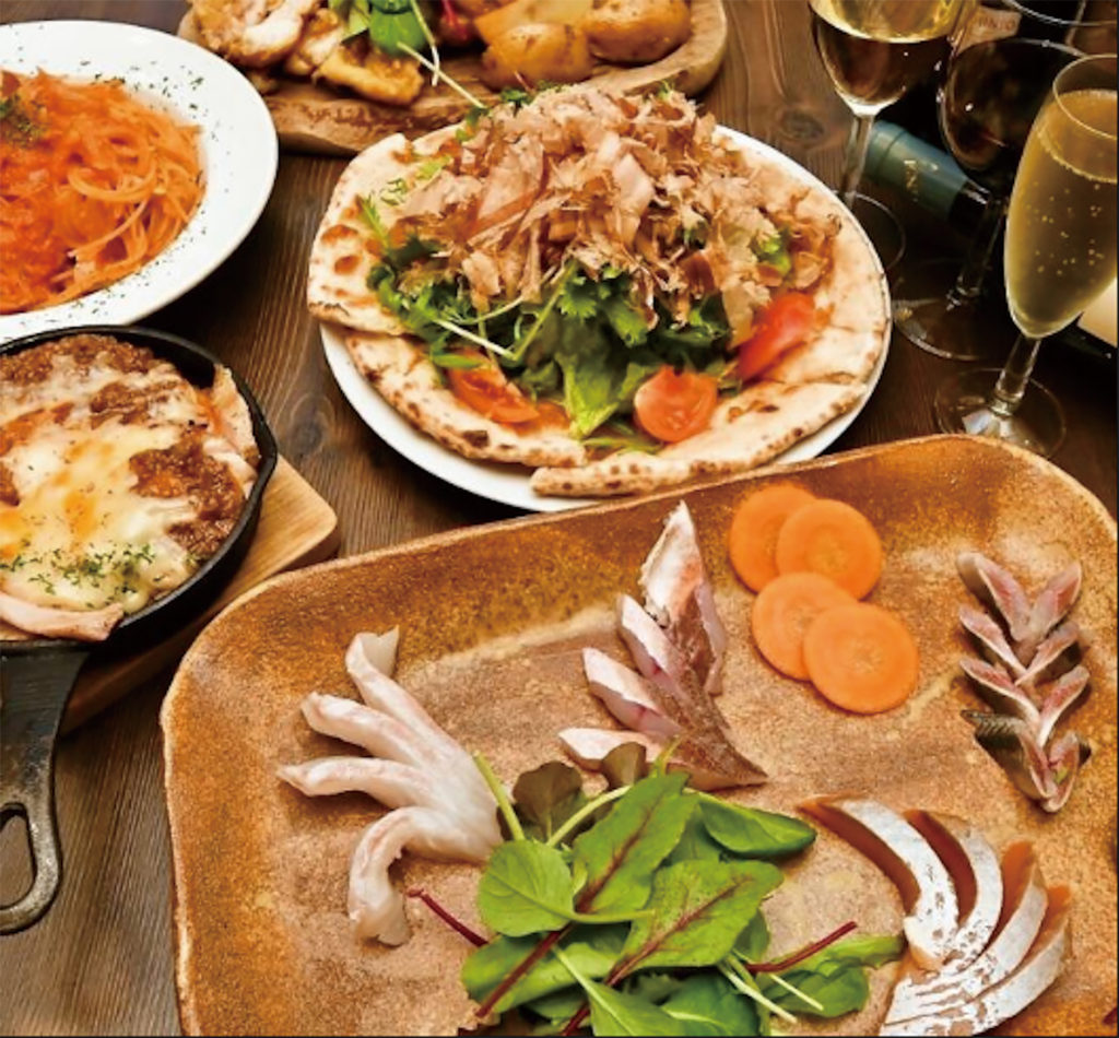 駅から徒歩1分。カルパッチョや鮪カマ焼きなどシーフードにこだわったイタリアンバル。宴会コースも提供しています。