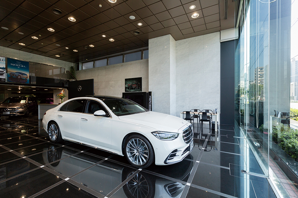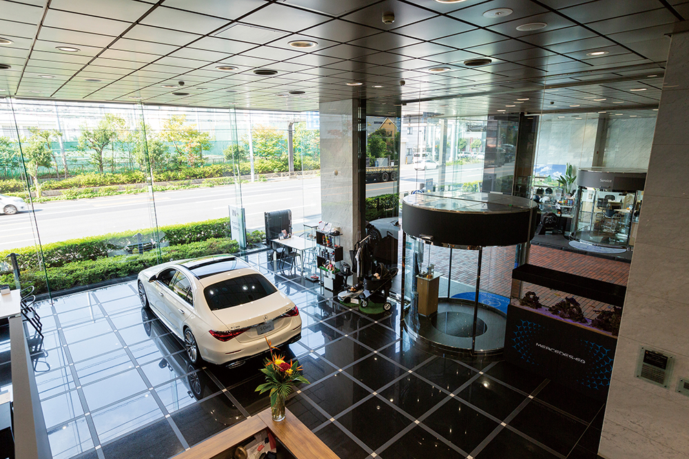黒御影石と大理石のショールームは、まさに「メルセデス·ベンツ」にふさわしい歴史を感じさせます。ラグジュアリーな雰囲気の中でメルセデスを感じながら、リラックスできる心地良い時間を提供しています。スタッフは、丁寧な接客と肩ひじ張らないフレンドリーさでお客さまファーストの対応。1階・3階のショールーム、屋上の認定中古車展示場に加え、国内有数規模のサービス工場を併設し、メルセデス・ベンツの購入からメンテナンスまで万全の体制でお客さまをサポート。技術レベルの高いスタッフが修理や整備を行います。話題の電気自動車をはじめ、充実のラインナップを揃え、近所に住むお客さまのお越しをお待ちしております。どうぞ気軽にお立ち寄りください。