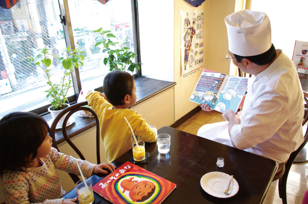 駅前通りの2階、青い看板が目印のスパゲッティ屋さん。11時30分から20時まで休まず営業しており、14時からのグラタンやピッツァのメニューも人気です。店内には絵本がたくさんあり、小さな子供のいるファミリーや、ママに優しいお店です。