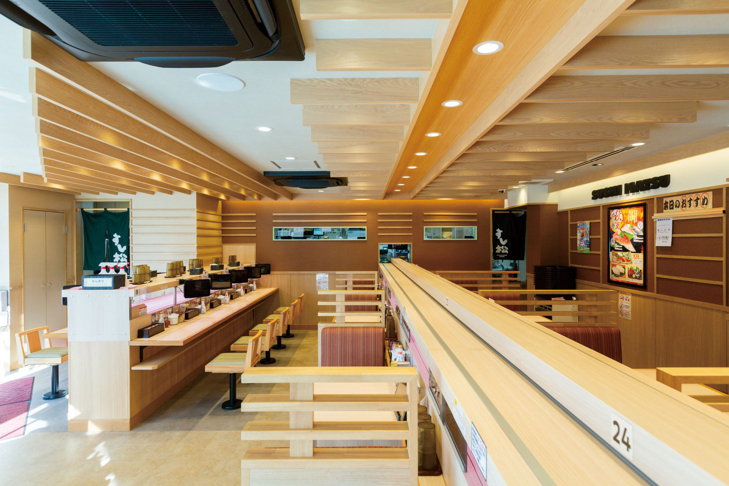 本店由具备30 年进货经验的老练专业采购员每天从丰洲市场进货鱼虾海鲜,保证了我们能为顾客提供价格实惠新鲜美味的寿司。时令鲜鱼、优质蓝鳍金枪鱼等讲究新鲜的上等寿司,就点一个都可以,很适合独斟独饮的顾客。本店安装了自助结账机,可用电子货币结账付款。